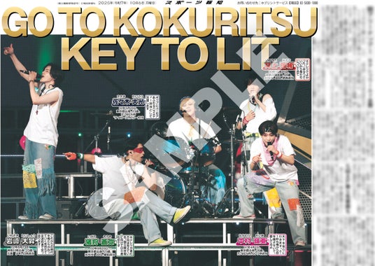 スポーツ報知を発行する報知新聞社(代表取締役社長・長谷川剛)は新聞の一部紙面をコンビニエンスストアのマルチコピー機からプリントできる「スポーツ報知コンビニプリント」サービスを展開中。スポーツ紙ならではの大きな写真を使った紙面をプリント版として販売しています。10月6日付掲載、ジュニアの5人組・KEY TO LIT(キテレツ)の自身初のアリーナツアー「WAKE UP THE FOOL」の千葉公演最終日の紙面を発売。全員パターン3種類と個人パターン5種類の合計8種類です。