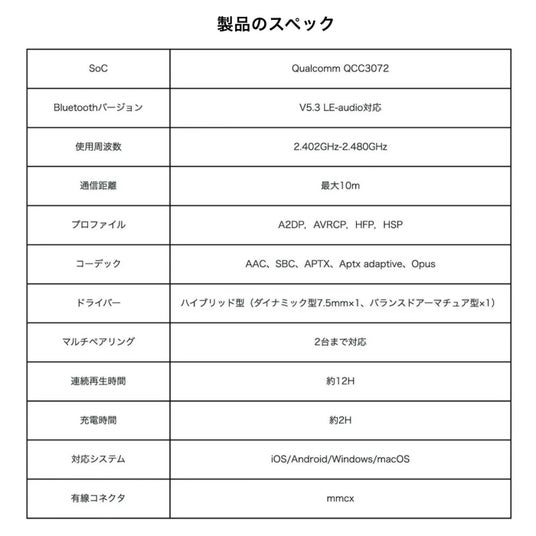 収納ケース・MMCX充電ケーブル・MMCX有線リケーブル・イヤーピース(S/M/L)付属