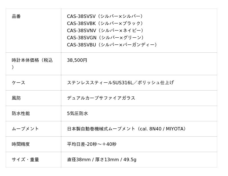 「クラシックシリーズ オートマティック スモールセコンド CAS-38」は、現代に求められるデザイン性と品質のバランスを高い次元で両立しながら、通常モデルは38,500円、IP仕様モデルは40,700円の価格で販売し、機械式ムーブメントの魅力を日常の中で楽しみたい人に最適な選択肢となることを目指しました。