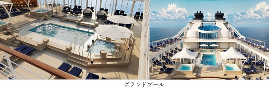 デッキ8の中央に位置する「グランドプール」では、開放感あふれる船上のリゾート空間を感じていただけます。MITSUI OCEAN FUJI(以下、三井オーシャンフジ)と同様に、2つの温水ワールプールや周囲にデッキチェア、テーブルを完備しております。また、三井オーシャンサクラの「グランドプール」には新たに足湯が登場します。足湯の座席にはお飲み物やタオルなどをお持ちいただける小さなテーブルが設けられています。洋服をお召しになったままご利用いただけるため、観光やアクティビティの合間のご利用もおすすめです。洋上で風を感じながら日本の四季や景色をご堪能ください。グランドプールに隣接する屋外の「プールサイドテラス/プールサイドバー」では、カジュアルにお召し上がりいただけるお料理をご用意しております。バーには「美と健康」をテーマに、季節のフルーツや野菜を選んでオリジナルスムージーを作ることができるコーナーを設置予定です。
