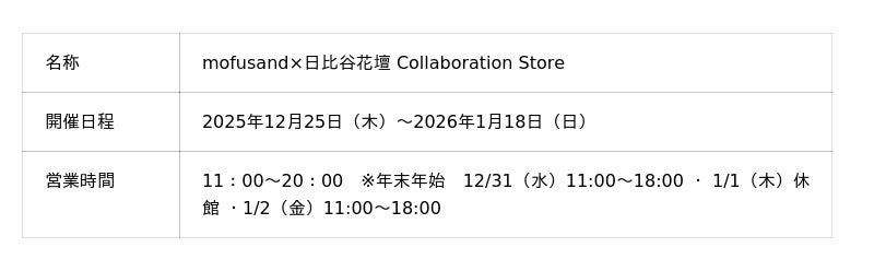 「mofusand×日比谷花壇 Collaboration Store」にて、第一弾となる「冬の花」プロダクトをメインに発売いたします。本コラボレーションの世界観を表現したフラワーショップならではの会場装飾は、当社がデザインおよび施工を担当します。