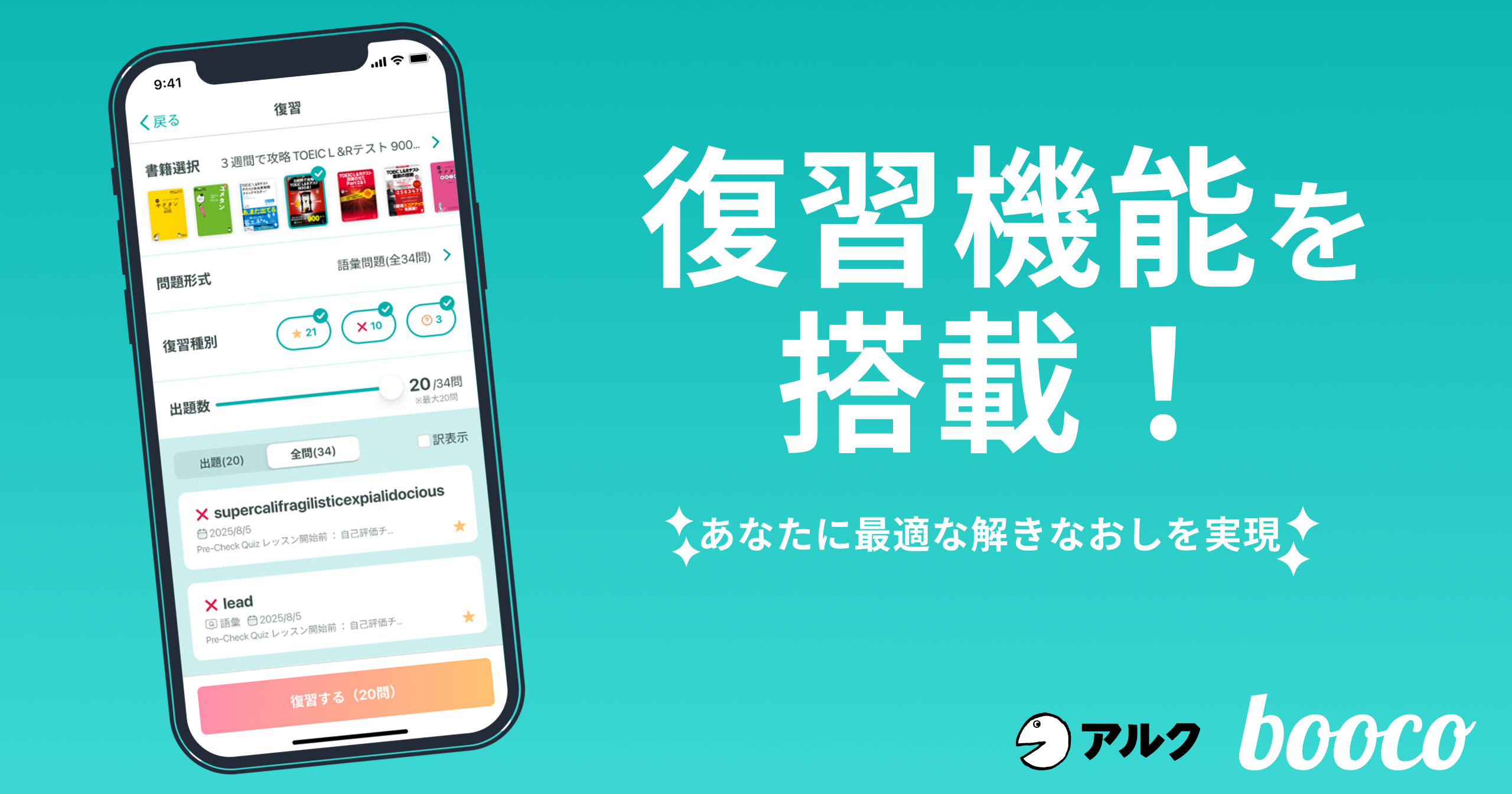 新たにクイズの復習機能を搭載!語学学習アプリ【booco】