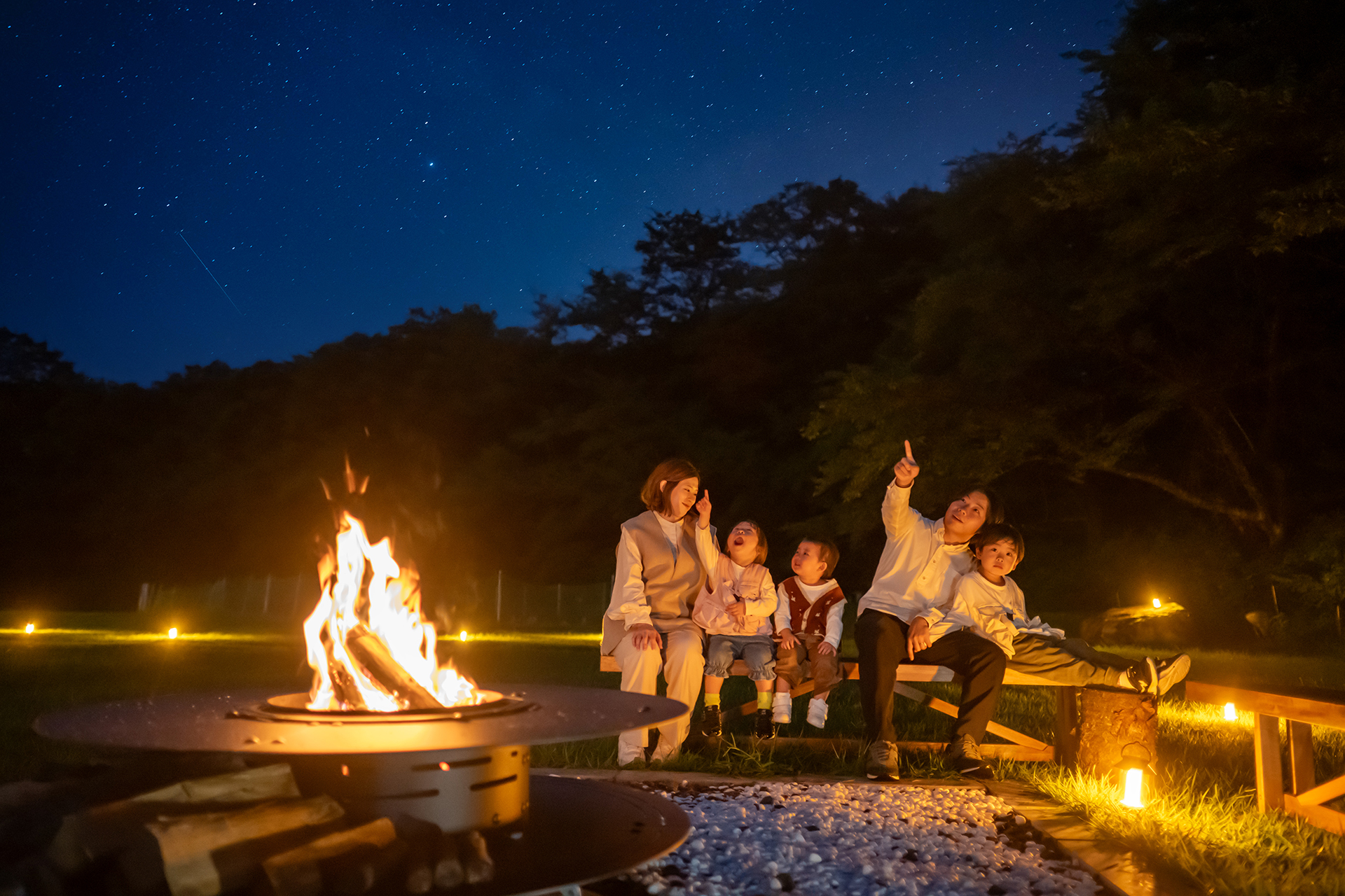 焚き火と満天の星。新設ファイヤーピットを囲み、紅葉が進む高原...
