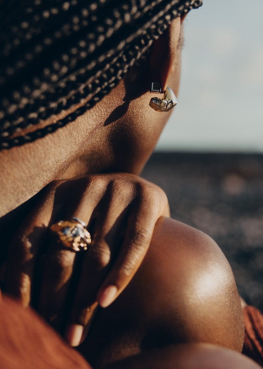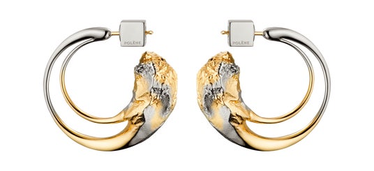 カプセルコレクションとなる3つのジュエリーは、鉱物からのインスピレーションはそのままに、「Eroz(エロズ)」コレクションのイメージの土台である岩石を思わせるデザインに様々な金属仕上げを探求しています。ピュスピアス、クレオールフープ、そしてリングからなる「Edition デュオ」のジュエリーは、24Kゴールドにパラジウムを混ぜ合わせることで、まるで今も溶け合っているかのような二重の輝きを放ちます。