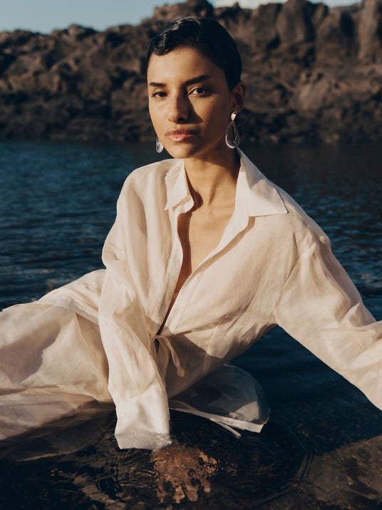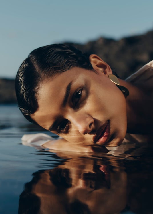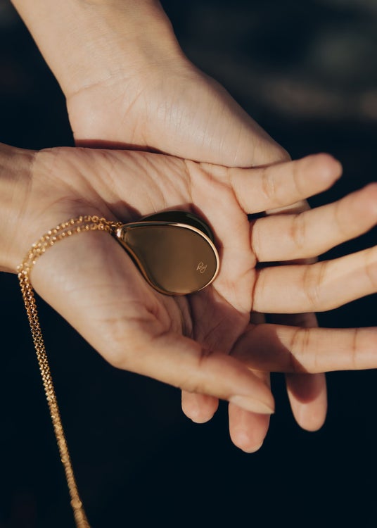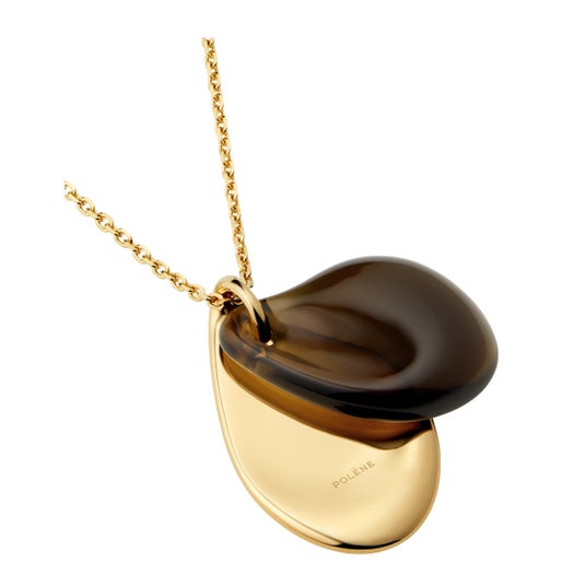 テーマを再解釈したダングリングピアスは、顔の周りを繊細な形で縁取るようにガラスがくり抜かれています。ピュスピアスは、24Kゴールドをコーディングした真鍮がガラスのしずくを再現しており、アシンメトリーとコントラストを楽しめます。また繊細なチェーンに取り付けられたペンダントは、ガラスのしずくと24Kゴールドを施した真鍮のプレートが組み合わされたもので、その下にはPoleneのロゴが刻まれています。