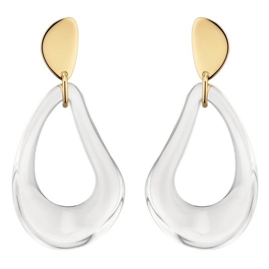 ピアスは、ゴールドと彫刻されたガラスの、2つのしずくをつるしています。