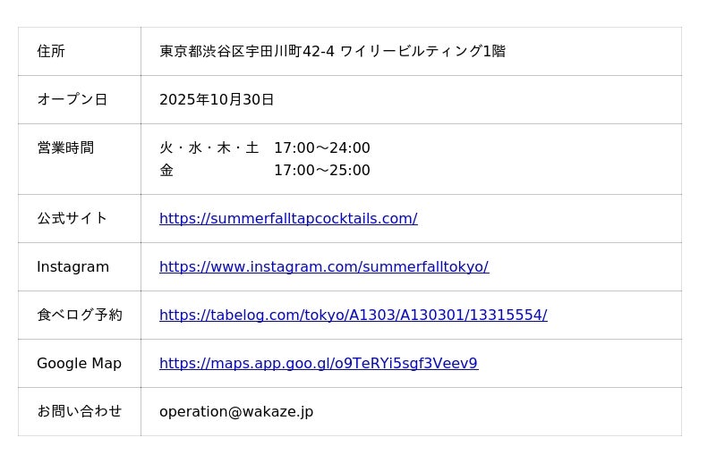 また、カクテルは1杯900円前後から提供され、従来「特別な場で飲むもの」とされていたカクテルを、日常的に楽しめる存在へと再定義しています。SummerFall Tap Cocktailsは、渋谷から世界へ向けて新しいアルコールカルチャーを発信し、若年層からインバウンドまで幅広い層に支持される「次世代の乾杯体験」の創出を目指しています。
