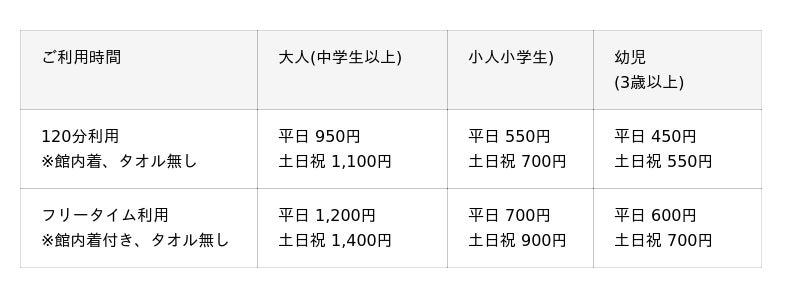レンタルアイテム:タオルセット330円、館内着330円、レンタル水着550円
