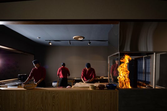 和食会場ではライブキッチンにてカツオの藁焼きも