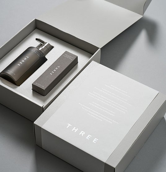 THREEのギフトラッピングは、どんなシーンにもお選びいただける、シンプルでエフォートレスなデザイン。古紙を40%以上を使用したリサイクルペーパーの質感が、洗練されたスリークさの中に上品な温もりを宿し、贈り手の想いをやさしく包みます。