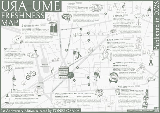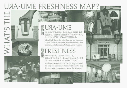 URA-UME FRESHNESS MAP本マップは観光地巡りを目的としたガイドではなく、街の日常に自然に混ざる体験を促すことを目的としたものです。路地の店舗、ローカルに根付いた店、偶然の発見を楽しむ場所など、東梅田の新しい街の温度を可視化しました。