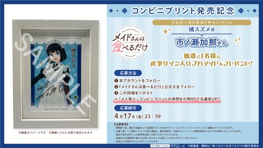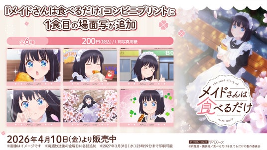 春アニメで話題沸騰中のTVアニメ『メイドさんは食べるだけ』コンビニプリントに「場面写」をプリントできるサービスが追加されました。