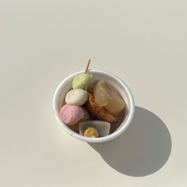 しょんぼりとおでん販売のコーナーへ。あと数食にすべり込みで間に合い、ほくほくといただきます。