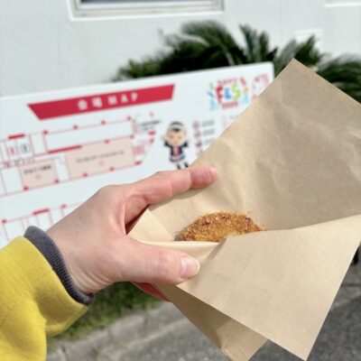 お隣のブースは、MCC食品とのコラボ商品〈ほぼホタテ入りクラムチャウダー〉。おいしそうな匂い!これは絶対食べとかないと……!と、食べ終わったおでんの器をゴミ箱に入れて振り向いた瞬間、さっきまであったはずのクラムチャウダーのお鍋は、きれいに片付けられていたのでした。