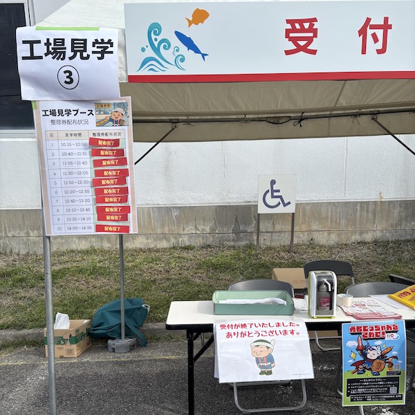 会場に入ると、工場見学も商品試食会も、ちくわ作り体験も、すでに受付は終了。まあ仕方ないわね、お買い物ができたらいいし!と物販ブースに向かうと、
