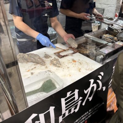 なんと言っても今回の目玉は、揚げたてじゃこ天!職人さんが手際よく揚げておられる天ぷらですが、揚げるの追いつかないんじゃない?という勢いでどんどん売れていきます。