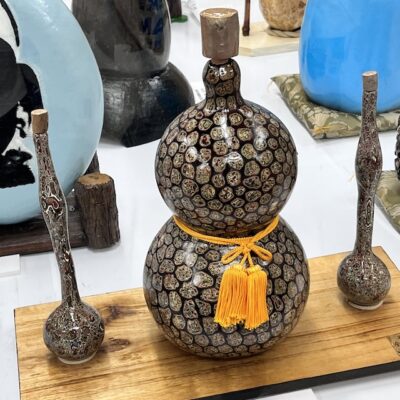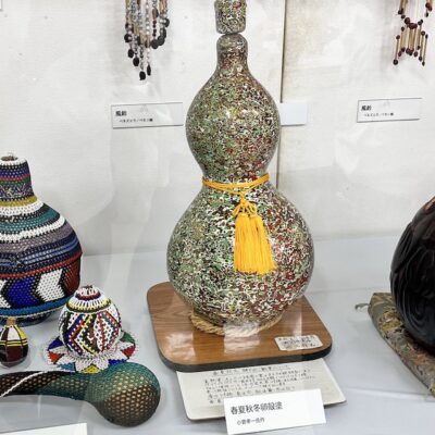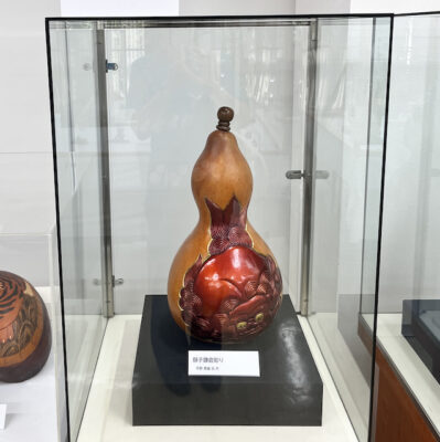 その隣にはペルーやコロンビアなどで作られた「ひょうたん動物」が並んでいましたが、世界の工芸品の紹介は明日にまわしましょう。飾り物としてのひょうたん工芸の技術力の高さを感じられるのは、やはり「全日本愛瓢会」会員の作品でした。