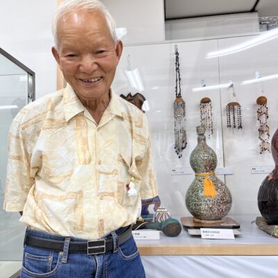 写真④⑤は、小菅孝一さんの作品。そして、写真⑥はちょうど会場を訪れていらしたご本人です。小菅さんは「全日本愛瓢会」の重鎮で、いろいろな加工技術をお持ちですが、なかでも研ぎ出し技法を得意とされています。写真④の《春夏秋冬卵殻塗》に添えられた説明によると、素ひょうたんの表面にボンドを塗り、卵殻を貼り付けてヤスリをかけ、その上に6色の油性ペンキを順番に塗り、乾燥させて水ペーパーで研ぎ出した作品だとのこと。写真⑤の作品などは、塗る削るを64回も繰り返したとおっしゃっていました。