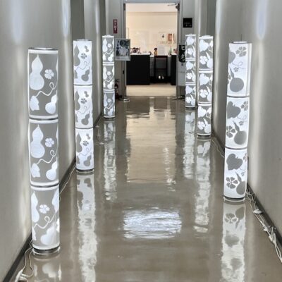 たとえば、写真①をご覧ください。これは、第一展示室「フラワーホール」と第二展示室「フラワールーム」をつなぐ廊下です。ひょうたんが浮かび上がる照明シェードは手づくりで、同じ場所に昨年飾られていたものとは少しデザインが違うとのこと。ひょうたんの実だけでなく、花や葉までデザインされています。