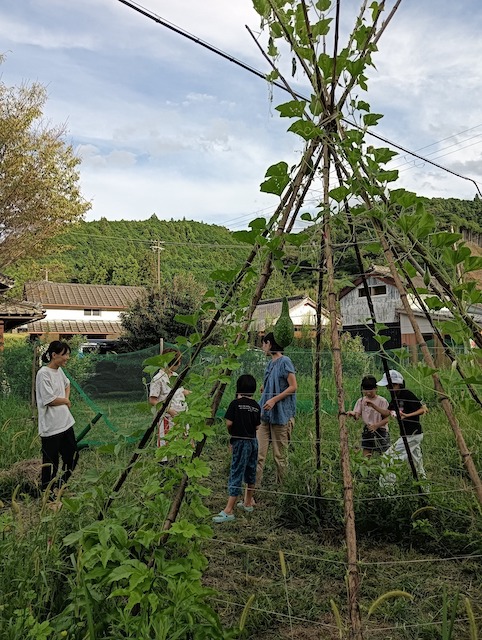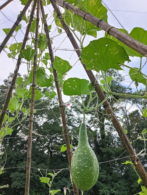 写真②③を見ると、ティピ型に組んだ柵のまわりに人が集まり、その中央に大きな涙型をした「へうたーん」の実がぶら下がっているのが見えますね。この実は9月に入ってから結実したのかな?だとすると、完熟までしばらくはひょうたん栽培の日々が続きそうですね。