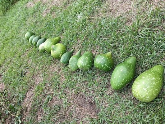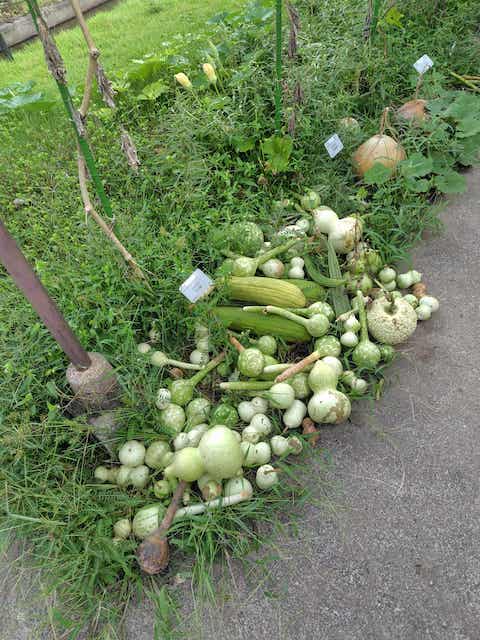 雑種のひょうたんが何代にもわたってかけ合わさっていくうちに、どの遺伝子の影響が強く残るのか。ともきちさんの収穫を見ていると、そんなことを調べてみたくなるような好奇心がわいてきますね。