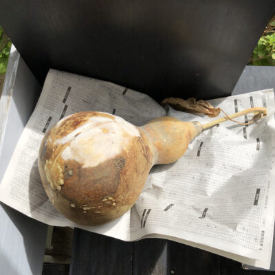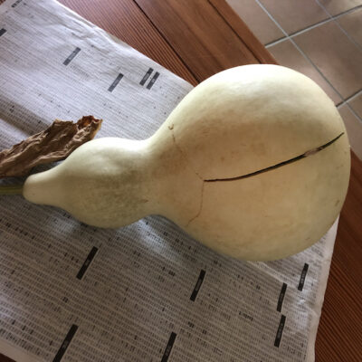 この実を屋内に置いておくと、全体にカビが生えてきました。写真⑤は9月23日のようす。このまま乾かして自然乾燥で仕上げたいと思っているそう。腐らずにうまく乾いてくれるといいな。とても形の良い実なので、ヒビやカビもアート的な味わいになってくれたらいいなと思います。