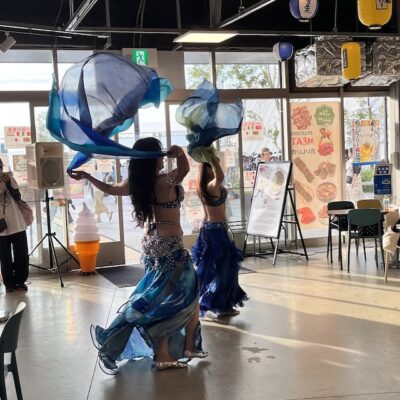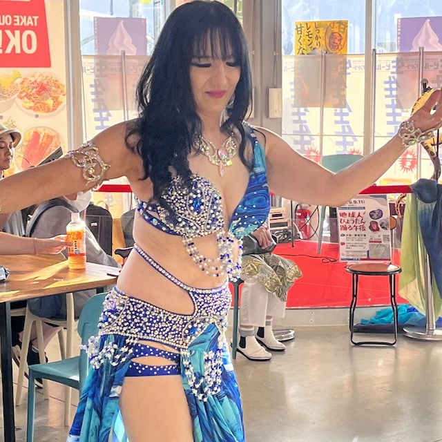 私の次に出演された「アウシャーヴ」はベリーダンスの二人組。きらびやかな衣装を身にまとい、妖艶なダンスを披露されました。あっというまに会場中の目が釘付けになったのが面白かったです。なかでもフードコート内で働いておられると思しき、若き外国人男性たちの目線の熱さがすごかった。(写真⑤⑥)