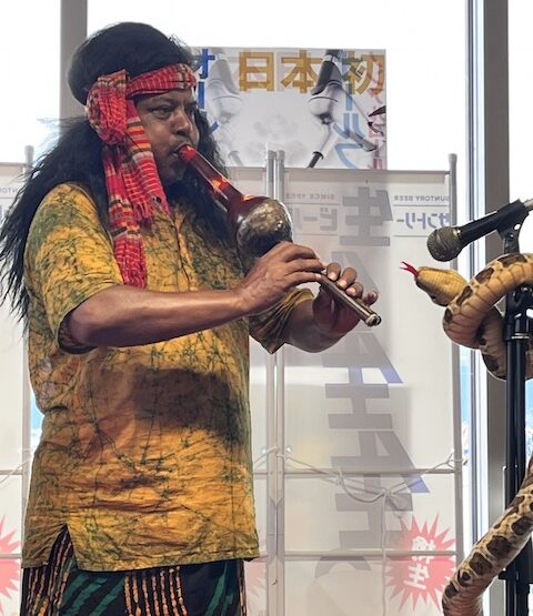 日本語が少しわかる音響スタッフさんに尋ねてみると、ヘビつかいの笛だとのこと。演奏家の方に通訳していただくと、やはりこれはひょうたん(Gourd)でできているとのことでした。楽器名も教えてくださったのですが、難しくてよく聞き取れませんでした。