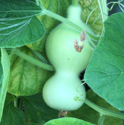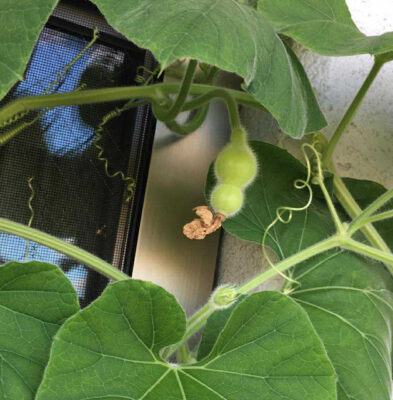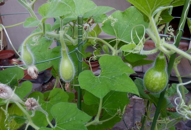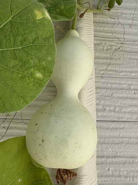 良かった!10月になって初めて結実するとはかなりのオクテ君ではありますが、本当に良かったです。今年の夏は暑すぎて、ひょうたんも苦しかったのかもしれません。おそらく実の数は自然に淘汰されるのではないかと思いますが、いちばんの問題は株がいつまでもつか。なるべく長生きしてもらって、もし途中で枯れたとしても2カ月後(12月)まで実を蔓にぶら下げておくのがいいと思います。オクテひょうたん「十市」、頑張れー!!