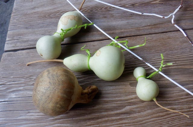 いっぽう、水耕栽培の千成ひょうたんのほうは無事に収穫を終えたそうです。写真⑤がその実たち。これから水浸けかな? 素ひょうたんとして完成したら、また姿を見せてくださいね。