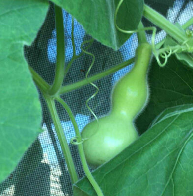 濃い緑色に白い斑入りで、しずくのような形をした実は、どうも一昨年あたりにヤブタさん(ヒロミさん)が育てておられたハイブリッド(イプとユーホーの交雑?)に似ているような気がします。ヤブタさんは、これも千成のはずだけど、とおっしゃっているのですが、ひょうたんというのは混ざりやすい植物。お父さんの見ていないところで子どもを作っていたのかもしれません。この謎ひょうたんも頑張って子孫を残してほしいなぁ。