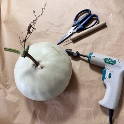 まず、ひょうたんにタネ出し用の穴を開けました。普通は蔓を切って口部に穴を開けるのですが、必ずしも口部でないといけないわけではありません。ですが、どこに開けるにせよ、ひょうたんにドリルを立てるのは勇気がいる。