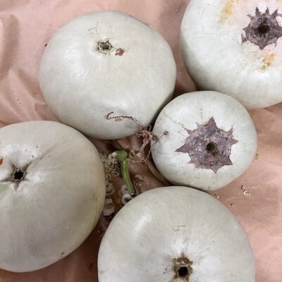 先週、先成りの実6個の収穫をお伝えしていたユーホー「アントニヌス・ピウス」。私は収穫したての、薄い緑色をしたひょうたんが大好き。ひょうたんが見せてくれる姿のなかでも、この状態がいちばん好き。できればこの状態をいつまでも眺めていたいと思うのです。