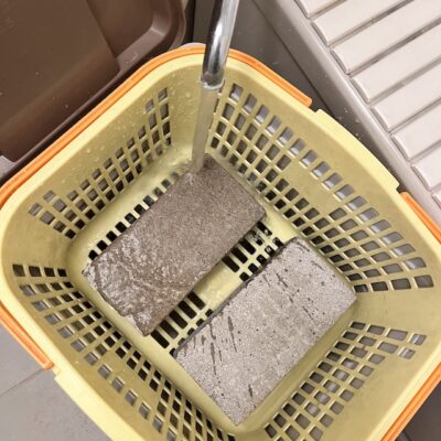 なんとか穴をあけたひょうたんはすべて洗濯ネットに入れ、その状態で45リットルのゴミ箱の底に。上にピッタリサイズのカゴを嵌め、重石をしてから水を注ぎ入れました。(写真③④)