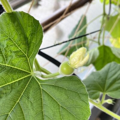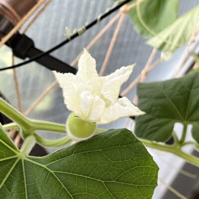 ……わずかにのこった「アントニヌス・ピウス」の緑色部分に雌花を発見!(写真⑥⑦)
