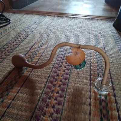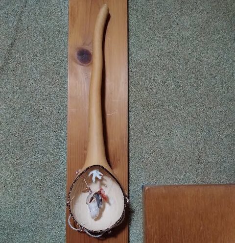 こちらはさらに変わった形をしています。ボディに使われている芸術的ぐにゃぐにゃのロングハンドルディッパーは、宮津道の駅で見つけたものだそう。よくこんなの見つけましたね!そのハンドルの真ん中あたりに、ひょうたんのカケラと王冠とラオスの鈴を銅線で結んであります。