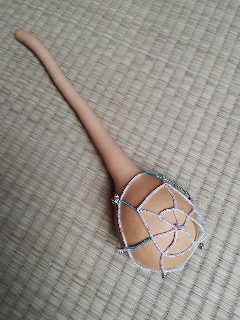 こちらは、おーさきさんの今のところの最新作。やはり鶴首ひょうたんをボディに使い、ひょうたんの内側に貝殻をぶら下げ、外側にビーズをまとっています。これも楽器であり、飾り物としても使える。貝殻のチョイスやビーズの色のチョイスがさりげなくて、センスを感じさせますね。