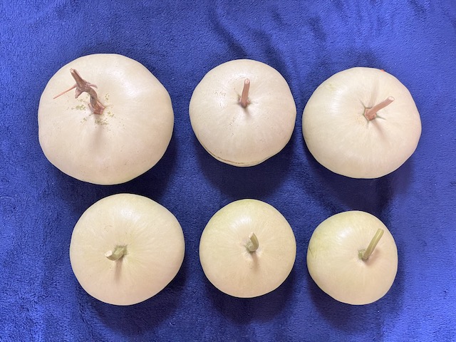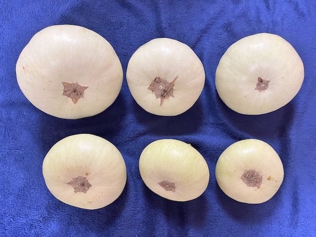 上段中央は8番目にできた「8号」。これもベランダの外側にできており、栽培中は様子がよくわかりませんでした。少し小ぶりで直径15センチ。側面にベランダのガラスに当たってついたキズがあり、お尻にもヒビが入っています。
