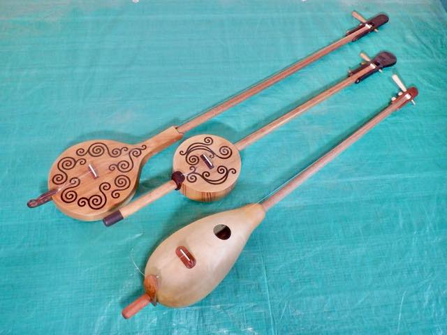 写真⑤や⑥の実たちは、将来どんな楽器となるのでしょう?ヤブタさんは以前収穫したひょうたんで、一弦楽器を制作されましたが(写真⑦手前)、次はウクレレを作ろうとただいま計画中だそう(図⑧)。