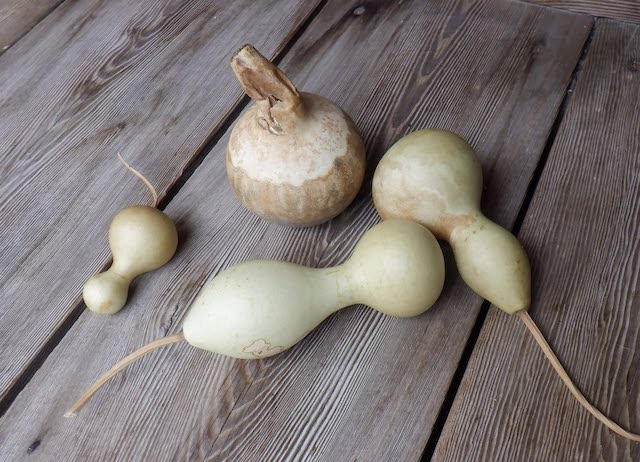 かわって写真④をご覧ください。こちらは、大阪市のヒョータニスト、杉浦こずえさんの十成ひょうたん「十市」の実です。2個とも秋風が吹き始めてから結実したというオクテ。先日収穫したとのことですが、完熟の目安となる受粉後60日にはギリギリ足りていたのでしょうか。