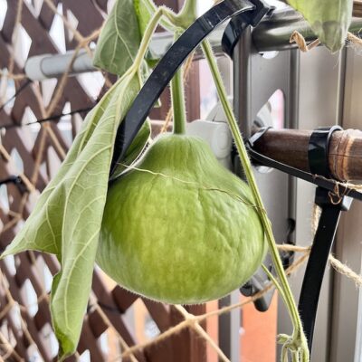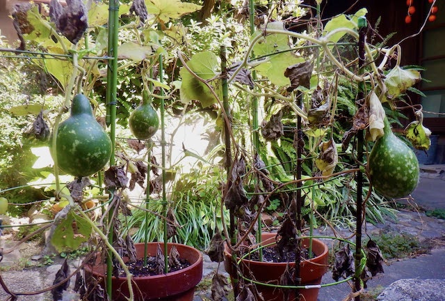 未熟なひょうたんは水浸けにするよりも、このように吊るして乾かすほうがよいのかもしれません。ということは、末成りの「20号」も軽くなるまで吊るしておくのがいいのかも。ベランダには他にも9月にできた「13号」〜「16号」の4個が残っているのですが、これはどうしょうかな。