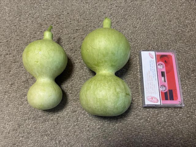 カセットテープの大きさから察するに、高さ15〜18センチくらい。左の実は上の膨らみが大きい完全な「たんひょう」、右の実もやや頭でっかちではありますが、どちらもウエストがきゅっと細く、口部が長めでなかなか良い形をしていますね。すでに水浸けも開始したということなので、どんな仕上がりになるか、そして来世はどんな楽器になるのか。楽しみにしていましょう!