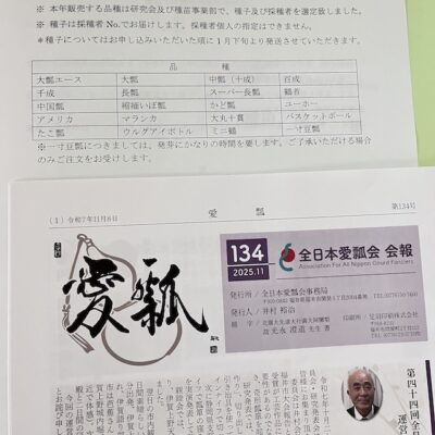 さて、ひょうたんの余生と、おそらく楽器になるであろう来世について考えていたら、「全日本愛瓢会」から機関紙『愛瓢』が封書で届きました。同封されていたのは来年の「種子の有償配布」のお知らせ(写真⑨)。
