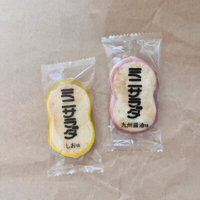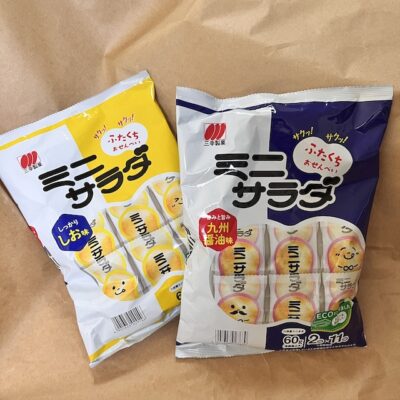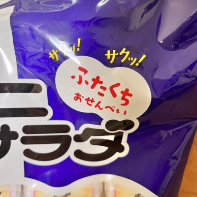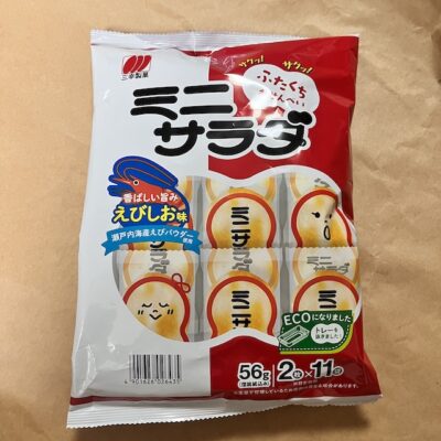 商品名は三幸製菓の〈ミニサラダ〉。お店のポップにはお買い得品マークがついていましたが、普通の棚に並んでいました。特に新商品というわけでもなさそう。ほぼ毎日きているスーパーなのに、私はなぜそれまで気がつかなかったのか?