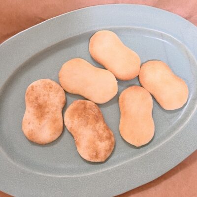 お皿にのせた左の2個が「九州醤油味」で右の4個が「しお味」です。形はどちらも、私の目にはひょうたん型にしか見えない。このようにくびれが少なくて口部がはっきりしない形をしたひょうたんは、実際によくあります。
