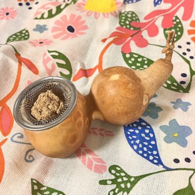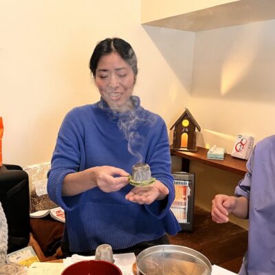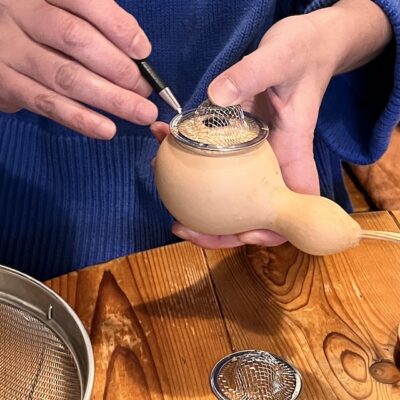 ひょうたんのかわりに100円ショップの茶こしを2個使っても温灸器が作れるとヤマミーさん(写真⑩)。身近なものを利用したアイデアが本当に素晴らしいですね。ヤマミーさんのお話では、春分と秋分にお灸をすると病気になりにくくなるという言い伝えもあるのだとか。