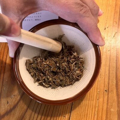 次は、もぐさ作りです。もぐさの原料はヨモギの若葉。干したヨモギ葉をスリコギですりつぶして、葉の裏にある白い毛の部分を取り出します。すりつぶし作業を行なっていると良い香りが漂って、それだけでもアロマテラピーの効果がありそう!(写真⑦)