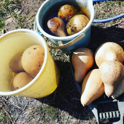 先週末には、12月に収穫して水に浸けていたひょうたんも、タネ抜き、皮むきの作業に着手したそうです(写真②)。いよいよこれで大団円。ひょうたんの一年に終わりが見えてきました。