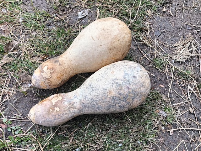 そんなわけで、ようやく収穫できたのが写真①のひょうたん。いろいろな品種が混じったハイブリッドひょうたんの「へうたーん」の実は、いろいろな形が出現してとても面白かったのですが、この二つも良い形。少し長めで、ゆるやかな曲線美を持ち、とても上品ですね。ちょっと「明日香美人」という珍しい品種のひょうたんを彷彿とさせます。