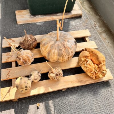 左のくしゃっと丸めた袋みたいなのが「17号」。小さい丸いひょうたんのうち、蔓のついているのが「18号」、手前が「19号」、奥の茶色いのが「20号」。この4つは実の成長途中で蔓自体が枯れてしまっため、皮の残骸みたいになってしまいましたが、こうやって並べてみると面白いです。